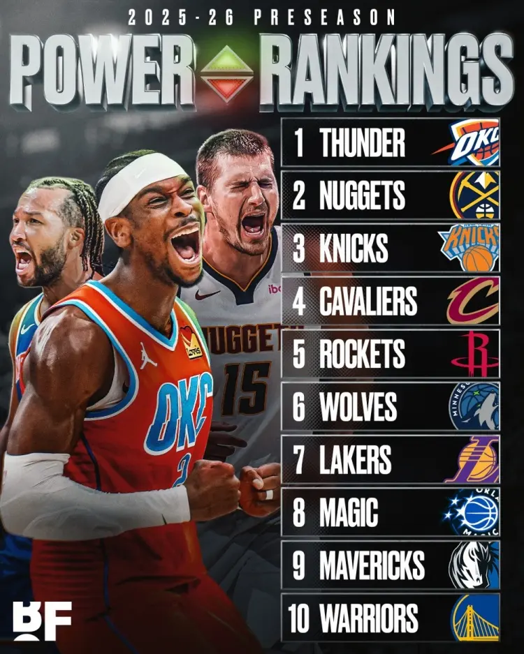 勇士队压线入选!在季前赛开打新赛季到来之际,美媒《BF》公布出新赛季实力榜TOP10名单,其中湖人队第7,遭遇范乔丹重伤的火箭队依旧位列第5。
